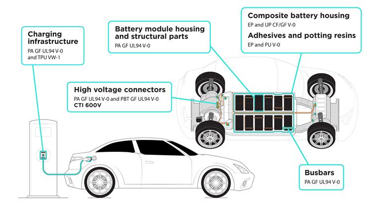 The flow of 1000 volts in a modern charger, for example, compared to 12 volts to charge a traditional ICE battery requires a different risk scenario e.g. materials passing higher fire standards and increased tracking resistance. Exolit OP 1400 meets these requirements.
